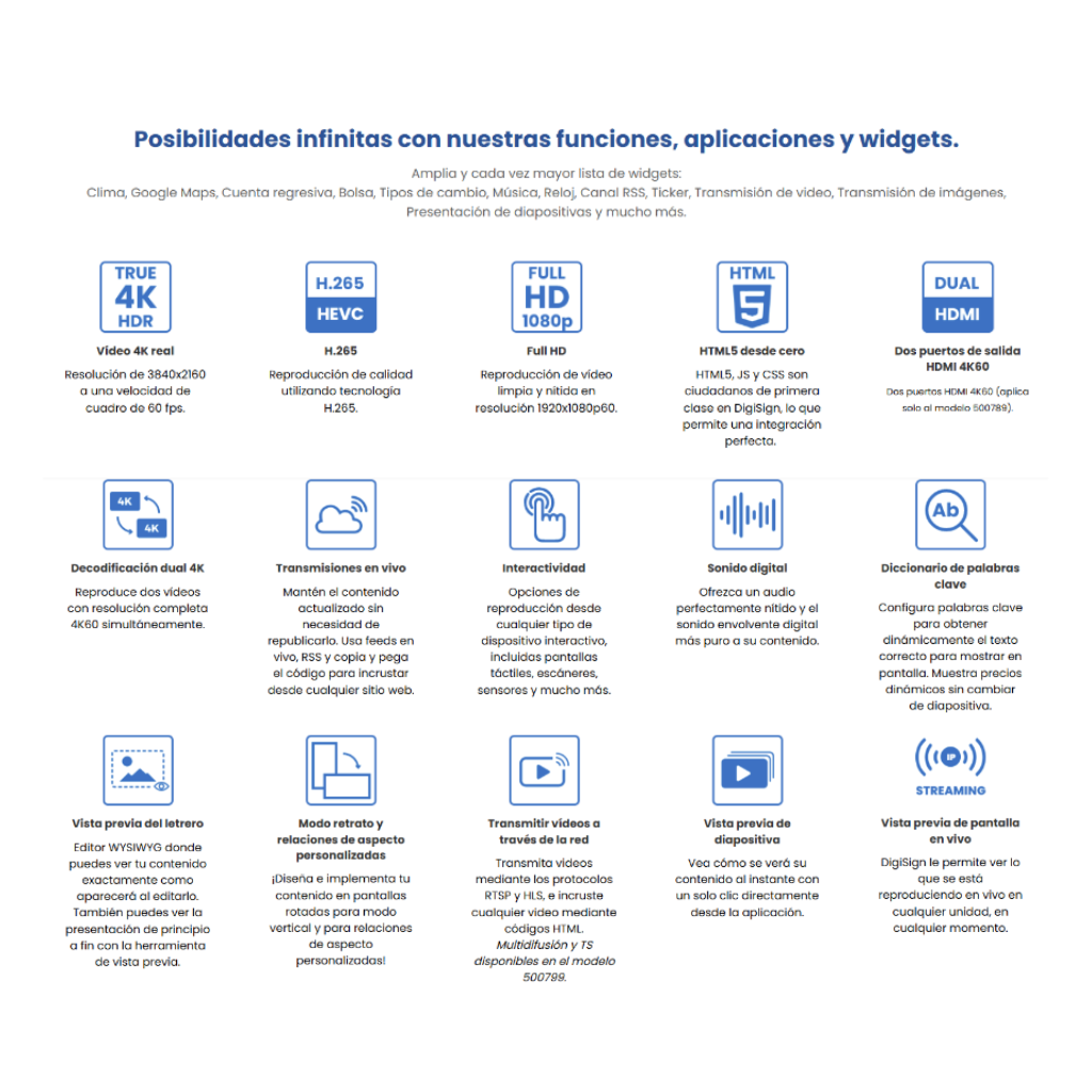 El sistema admite infinitas posibilidades con sus funciones, aplicaciones y widgets para teletipos, relojes, información meteorológica, Google Maps, cuentas regresivas, bolsa de valores, tipos y tasas de cambio, música, canales de redes sociales, transmisión de video, Transmisión de imágenes, Presentación de diapositivas y mucho más.