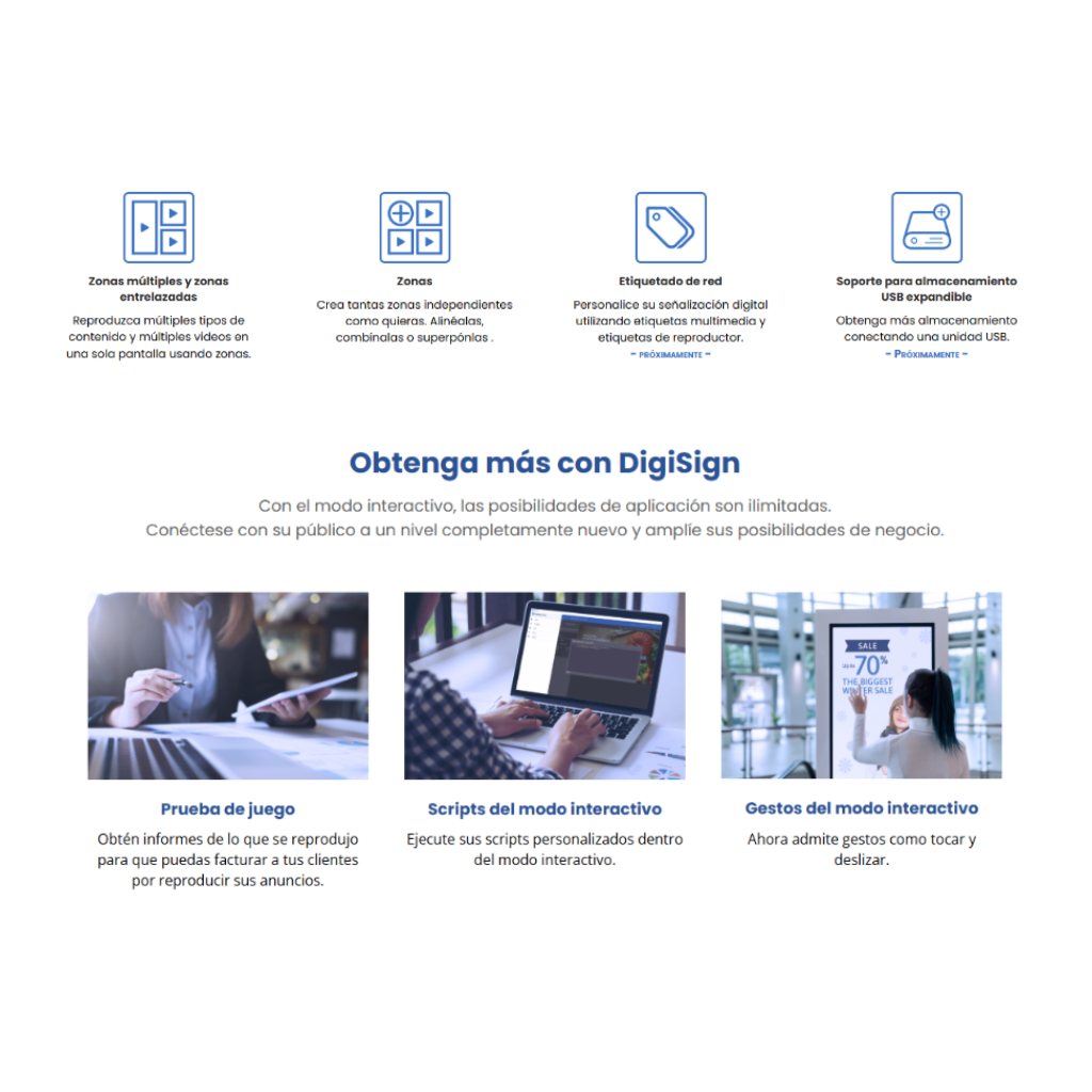 La plataforma de DigiSign ofrece numerosas ventajas que revolucionan la forma en que se comparte y presenta la información y publicidad de su empresa o negocio. Con plantillas de impacto y contenido dinámico, DigiSign cautiva a su audiencia y mejora la comunicación hacia la audiencia.