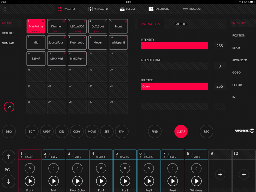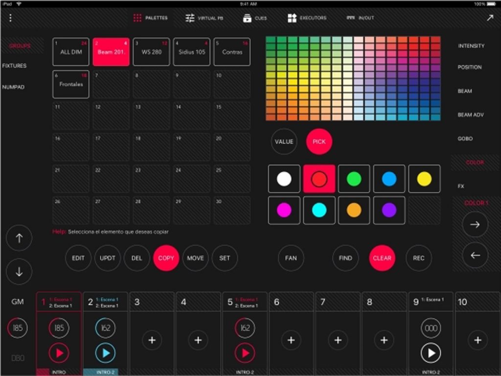 Además del control clásico directamente desde la consola, también puede tener el control desde las pantallas de la PC, teléfono inteligente y la tableta. Los dispositivos conectados a través de W-LAN se pueden utilizar para el control de la iluminación en tiempo real sin demora.