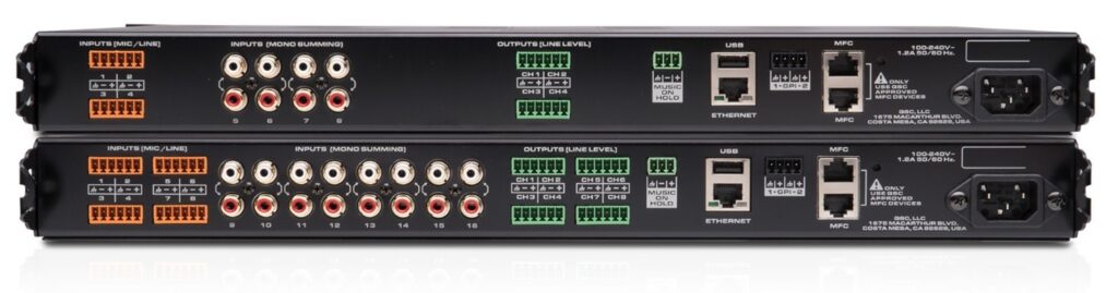 Adicionalmente estos mezcladores incluyen un par de puertos RJ45 o Ethernet llamados puertos MFC que permiten conectar hasta 4 controladores de pared MFC por puerto, es decir 8 en total por mezclador, los cuales como su nombre lo indican permiten controlar el sistema a través de los mismos sin necesidad de entrar al software de administración o a la aplicación, haciendo más práctico y rápido el control para el usuario final. Estos vienen disponibles en negro y blanco para adaptarse mejor a la estética y arquitectura de los diferentes lugares. Cada puerto MFC soporta un máximo de 250 metros de longitud de cable, lo cuál permite una amplia distribución dentro de un recinto.